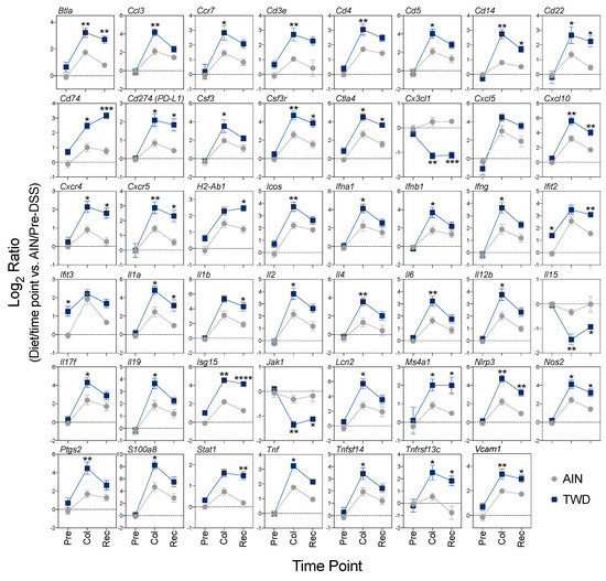 Expression profiles for selected genes of interest associated with immune and inflammatory responses. Values shown are the average log2 ratio ± SEM for selected genes calculated with AIN/Pre-DSS as the reference. Significant differences in expression (FDR-corrected q-value < 0.05 and log2 ratio > 1 or < −1) between TWD and AIN diets at each time point are noted as follows: * q < 0.05; ** p < 0.01; *** p < 0.001; **** p < 0.0001. Statistical results for comparisons across time points within each diet group are not shown here, but are available in File S2 along with the specific FDR q-values for the significant observations noted in the figure. Pre, pre-DSS; Col, colitis; Rec; recovery.