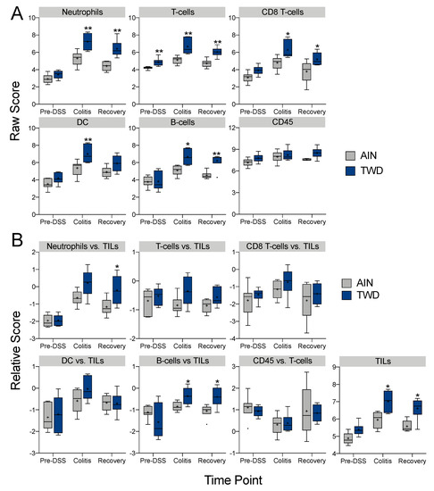 Profiling of immune cell types in colon tissues obtained at pre-DSS, colitis or recovery time points from mice fed either AIN or TWD. (A) Data shown are the log2 scores for the indicated cell types, and only those cell types that met quality control testing for correlation of marker gene expression (p < 0.05) are shown. Scores may be compared within a cell type for both diet and time point, but comparisons across cell types are not appropriate for this method of quantitation. Scores do not convey information about the absolute number of cells in the samples. (B) Data shown are the relative cell type measurements with respect to total infiltrating leukocytes (TILs). * p < 0.05 and ** p < 0.01 compared to time point-matched AIN control as determined by the non-parametric Steel-Dwass test.