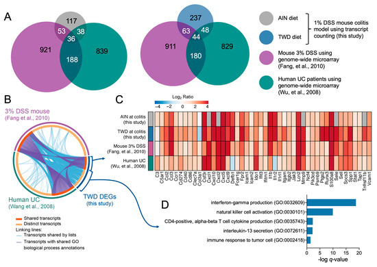 Because the mouse DSS colitis model most closely approximates human UC, we compared the transcript profile obtained in this study using the NanoString platform to the list of DEGs identified by Fang, et al. [66] using the 3% DSS model and to DEGs identified by Wu, et al. [68] in human UC patients (Figure 12). A larger set of commonly regulated genes was discovered (46 total), with notable consistent expression for many transcripts across all studies, including Csf3r, Cxcl2, Cxcl5, Ido1, Il1b, Lcn2, Mmp9, S100a8, and Spp1 (Figure 11B,C). Alternatively, a large portion of the colitis TWD-regulated gene set was unique to this study, as these genes did not meet significance criteria in either the mouse DSS or human UC genome-wide studies (Figure 12B,D). Interestingly, these unique DEGs are annotated with GO biological process terms associated with IFNγ regulation and secretion (GO:0032609), IL-13 secretion (GO:0030101), and immune response to tumor cell (GO:0002418) (Figure 12D). However, we did note very high overlap in biological processes for all the DEGs identified at colitis in TWD-fed mice (note blue lines in Figure 12B), suggesting functional redundancy captured by other DEGs in the comparison studies. The differences in DEGs identified in our study compared to others using DSS to induce colitis may be related to the amount and duration of DSS treatment (1% for 10 days in this study versus 3% to 4% for 5 to 8 days in other reports). Or, the differences may be due to the nature of the NanoString technology, which allows for detection of small populations of mRNA, lacks bias that can be introduced through sample processing and amplification, and has the capacity for detecting transcripts in less-than-ideal quality samples.