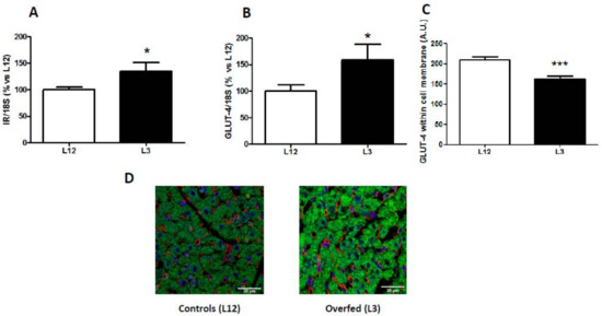 Gene expression of (A) insulin receptor (IR) and (B) glucose transporter 4 (GLUT-4), and GLUT-4 localization (C,D) in hearts from rats raised in L12 or L3 litters. Note: * p < 0.05 difference between L3 and L12; *** p < 0.001 difference between L3 and L12. Values are represented as mean ± SEM (n = 4–5 rats/experimental group) and expressed as % vs. L12. All samples were run in duplicate. Data were analyzed by Student’s t-test. Scale bar in D denotes 20 µm.