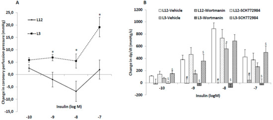 Changes in coronary perfusion pressure (A) and dP/dt (B) in response to insulin (10−10–10−7 M) compared to basal levels before insulin administration, in perfused hearts from rats raised in L12 or L3 litters, in the absence or presence of the phosphoinositide 3-kinase (PI3K) inhibitor wortmanin (10−6 M) or the inhibitor SCH-772984 (3.10−6 M). Note: * p < 0.05 difference between L3 and L12; # p < 0.05 difference between hearts in the presence or absence of wortmannin; $ p < 0.05 difference between hearts in the presence or absence of SCH-772984. Values are represented as mean ± SEM; n = 6–9 rats/experimental group. Data were analyzed by Student’s t-test for each insulin dose.