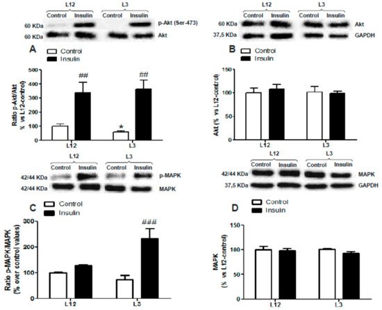 Protein levels of (A) ratio of phosphorylated to total Akt (p-Akt/Akt), (B) total Akt (Akt), (C) ratio of phosphorylated to total mitogen-activated protein kinase (MAPK) (p-MAPK/MAPK), and (D) total MAPK (MAPK) in perfused hearts from rats raised in L12 or L3 litters, incubated either with vehicle (control) or with insulin (10−7 M) for 30 min. Note: * p < 0.05 difference between control hearts from L3 and L12; ## p < 0.01; ### p < 0.001 difference between hearts incubated with insulin and control. Values are represented as mean ± SEM (n = 4–5 rats/experimental group) and expressed as % vs. L12. Data were analyzed by two-way ANOVA followed by Bonferroni post-hoc test.