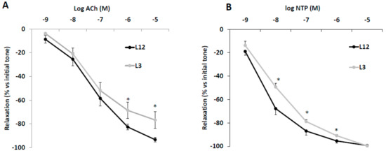 The vascular response of aortic rings from L12 and L3 rats to Ach and NTP are shown in Figure 4A,B, respectively. Aortic rings from overfed rats showed decreased vasorelaxation in response to high concentrations of Ach (10−6 and 10−5 M) (p < 0.05 for both). Likewise, vasorelaxation in response to NTP was significantly reduced in L3 rats compared to controls at dosages between 10−8 and 10−6 M (p < 0.05 for all).