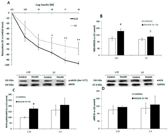 Relaxation to insulin (10−11–10−6 M) of precontracted aortic rings (A), nitrite and nitrate release (B), ratio of phosphorylated to total eNOS (p-eNOS/eNOS) (C) and total eNOS (eNOS) (D) in aorta segments from rats raised in L12 or L3 litters incubated over 30 days with either vehicle (control) or insulin (10−7 M). Note: * p < 0.05; ** p < 0.01 difference between aortic rings from L3 and L12; # p < 0.05; $ p < 0.05 difference between hearts incubated with insulin from L3 and L12. Values are represented as mean ± SEM (n = 4–5 rats/experimental group) and expressed as % vs. L12. (n = 6–9 rats/experimental group). Data were analyzed by two-way ANOVA followed by Bonferroni post-hoc test.
