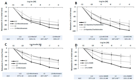 Relaxation in response to insulin (10−11–10−6 M) of precontracted aortic rings from rats raised in L12 or L3 litters in the absence or in the presence of A) the cyclooxygenase inhibitor meclofenamate (10−5 M), B) the potassium channels blockers apamin (10−6 M) plus charybdotoxin (10−7 M), C), the PI3K inhibitor wortmanin (10−7 M), and D), the nitric oxide synthase inhibitor L-NAME (10−4 M). Note: * p < 0.05 difference between aortic rings from L3 and L12; # p < 0.05; ## p < 0.01 difference between aortic rings incubated with the blockers and control. Values are expressed as percentage of initial tone and represented as mean ± SEM; n = 6–13 rats/experimental group. Data were analyzed by two-way ANOVA followed by Bonferroni post-hoc test.