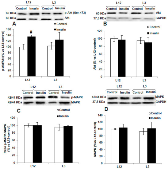 Protein levels of (A) ratio of phosphorylated to total Akt (p-Akt/Akt), (B) total Akt (Akt), (C) ratio of phosphorylated to total MAPK (p-MAPK/MAPK), and (D) total MAPK (MAPK) in aortas from rats raised in L12 or L3 litters, incubated with vehicle (control) or with insulin (10−7 M) for 30 min. Note: # p < 0.05; difference between hearts incubated with insulin and control. Values are represented as mean ± SEM (n = 6–9 rats/experimental group) and expressed as % vs. L12. Data were analyzed by two-way ANOVA followed by Bonferroni post-hoc test.