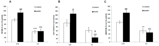All data are represented as mean ± SEM. Differences between L3 and L12 rats variables were examined by Student’s t-test or by two-way ANOVA followed by Bonferroni’s test for data obtained from experiments performed in the presence or absence of insulin. Differences were considered significant when p < 0.05.