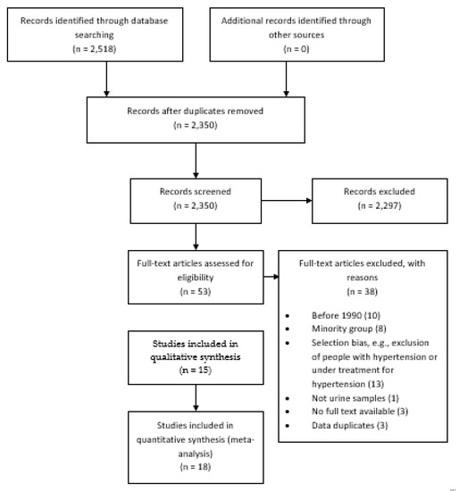 Therefore, to improve the evidence for Latin America and the Caribbean so that it can inform local policies and surveillance systems, we aimed to synthesize the available information on sodium consumption at the general population level in these countries. For this, a systematic review was conducted to provide recent population-based estimates on sodium consumption using urine samples (i.e., 24 h, 12 h, overnight or spot samples); we also highlighted research needs and opportunities.