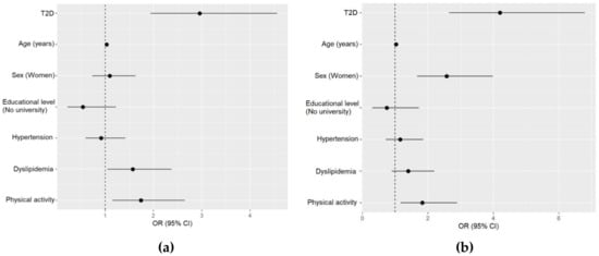Multivariable analyses for the alternate Mediterranean Diet (aMED) score and alternate Healthy Eating Index (aHEI), including all the study groups. (a) Multivariable logistic regression for the aMED high tertile (6–9 points). Hosmer–Lemeshow test p < 0.001; (b) multivariable logistic regression for the aHEI high tertile (≥46 points). Hosmer–Lemeshow test p < 0.001. T2D, type 2 diabetes.