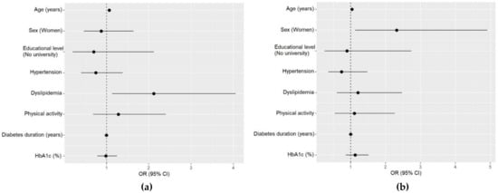The adjusted multivariable analysis including only the T2D group showed that increasing age (OR: 1.06, 95% CI: 1.03–1.11, p < 0.001) and dyslipidemia (OR: 2.12, 95% CI: 1.13–4.06, p = 0.021) were positively associated with the highest tertile of the aMED score (Figure 2a). On the other hand, the multivariable analysis for the aHEI showed that female gender (OR: 2.32, 95% CI: 1.13–4.92, p = 0.025) was related with higher aHEI scores in T2D (Figure 2b). We did not find any association between HbA1c or BMI with aMED and aHEI (data not shown).