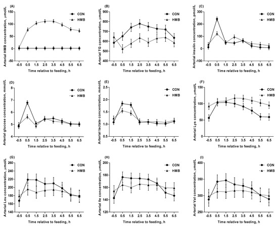 Arterial concentrations of HMB (A), TG (B), insulin (C), glucose (D), lactate (E), Lys (F), Leu (G), Ile (H), and Val (I) in control (CON) and HMB-supplemented (HMB) sows during late gestation. Data are expressed as the mean ± SEM. Sows were regarded as the experimental units, n = 4 for each group. Interaction of treatment and sampling time after feeding were observed for arterial concentration of HMB (p < 0.001), TG (p = 0.06), insulin (p < 0.001), glucose (p < 0.001), lactate (p = 0.002), Lys (p = 0.003), Leu (p = 0.02), Ile (p = 0.006), and Val (p = 0.006), respectively. CON = control; HMB = β-hydroxy-β-methyl butyrate; TG = triglycerides.