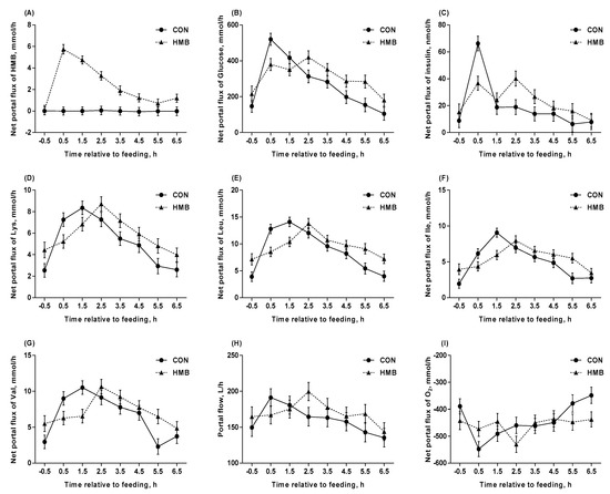 Dietary supplementation of HMB increased the net portal fluxes of HMB (p < 0.001, Table 4) and Cys (p = 0.005), and tended to increase the net portal flux of NEFA (p = 0.09), while it tended to decrease the net portal flux of acetate (p = 0.09). The net portal fluxes of insulin, lactate, and Ala at DIM –3 were lower than that at DIM –10 (p < 0.05). Interaction between treatment and DIM was observed for portal flow, net portal fluxes of insulin, Met and Asn (p < 0.05). All measured net portal fluxes, except for urea, NEFA, TG and VFA, were affected by ST (p < 0.05). Interactions between treatment and ST was observed for HMB, glucose, insulin, Lys, Leu, Ile, Val, portal flow, and net portal flux of O2 are illustrated in Figure 3. Interaction between treatment and ST was observed in most measured net portal fluxes (p < 0.05, Table 4 and Figure 3), except for CO2, lactate, urea, NEFA, TG, Asp, Glu, Gly, Gln and VFA. Relative to feeding, the net portal fluxes of most AA peaked 2.5 h after feeding in sows fed with HMB, while they peaked 1.5 h after feeding in CON sows (Figure 3). Dietary supplementation of HMB increased the net portal recovery of Ala (p = 0.04, Table 5) and Asp (p = 0.003). All net portal recovery of AA did not differ across DIM (p > 0.05). The net portal recovery of HMB in sows fed HMB was 88%.