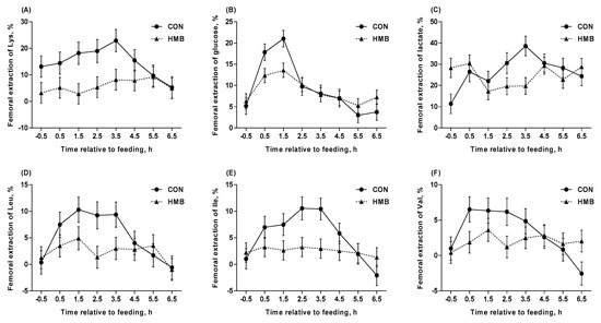 Femoral extractions of Lys (A), glucose (B), lactate (C), Leu (D), Ile (E), and Val (F) in control (CON) and HMB-supplemented (HMB) sows during late gestation. Data are expressed as the mean ± SEM. Sows were regarded as the experimental units, n = 4 for each group. Interactions of treatment (CON, HMB) and sampling time after feeding were observed for femoral extractions of Lys (p = 0.001), glucose (p = 0.004), lactate (p = 0.006), Leu (p = 0.10), Ile (p = 0.01), and Val (p = 0.04), respectively. CON = control; HMB = β-hydroxy-β-methyl butyrate.