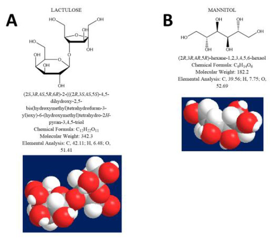 A measure of IP [13,14] is based on the detection of specific probes, either in blood or in urine [1]. Non-metabolizable sugars, chromium-labelled EDTA (51Cr-EDTA), and polyethylene glycols (PEG) are typical marker probes [15]. In humans, IP at the level of duodenum and small intestine is measurable after oral administration of large oligosaccharide probes, such as lactulose (LA) (m.w. 342.3), combined with a small sugar such as mannitol (MA) (m.w. 182.2) [16]. Both these probes are equally affected by gastrointestinal dilution, motility, bacterial degradation, and renal function. Therefore, the LA/MA ratio is corrected for possible confounding factors [3], as a marker of paracellular permeability in the small intestine [14,17]. Sucrose (SO) (m.w. 342.3), by contrast, tests the permeability of the upper intestinal tract, since it is degraded by duodenal sucrose [14]. Sucralose (SA) (m.w. 397.6) is an artificial sugar poorly absorbed in the human intestine, not degraded by intestinal bacteria, and useful in assessing the permeability of the entire intestinal tract [3] and colon [18] (Figure 1A–D).