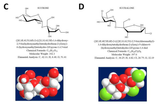 Chemical and 3-D formulas of the sugar probes used for the study of intestinal permeability at different tracts: Lactulose (A), mannitol (B), sucrose (C) and sucralose (D).