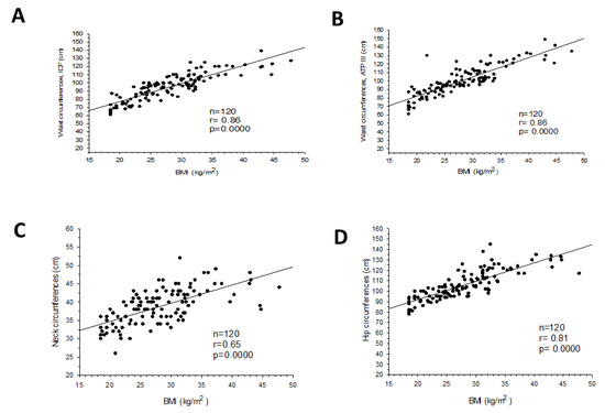 Correlation between body mass index (BMI) and waist circumference according to: International Diabetes Federation (IDF) (A), Adult Treatment Panel III (ATPIII) (B), neck circumference (C), and hip circumference (D).