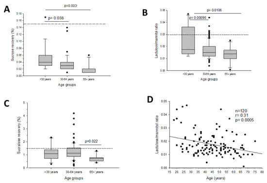 Gastrointestinal permeability changed between age groups at every tract (i.e., < 30 years; 30–64 years; and ≥ 65 years). Stomach and small intestinal permeability decreased with age (Figure 3A–B). The same findings were obtained at the colonic level, especially in the ≥65 years subgroup (Figure 3C). Interestingly, the strongest evidence was found when small intestinal permeability was plotted against increasing age, a finding persisting in both sexes (Figure 3D).