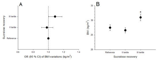 In the whole population, the OR of BMI increment according to sucralose excretion was significantly higher in subjects in the highest tertile (sucralose excretion >1.45%; OR 1.085 [95% CI: 1.006, 1.17]), than in those in the reference and in the second tertile. The result persisted (1.06 [95% CI: 1.003, 1.18]) after adjusting for age and consumption of junk food (junk score), considered as covariates (Figure 5A). The average BMI was higher in subjects in the highest tertile of sucralose excretion, as compared to those in the reference group and in the second tertile (Figure 5B).