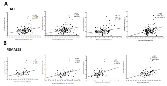 Correlation between sucralose recovery and waist, neck, and hip circumferences in: All subjects (A) and in females (B).