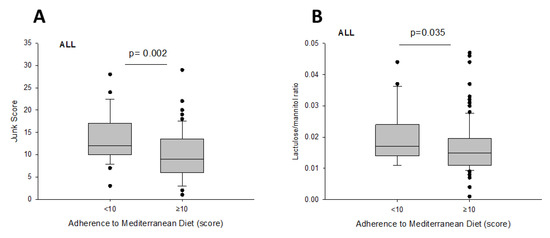 Differences in ‘Junk Score’ (A) and small intestinal permeability (B) according to adherence to Mediterranean Diet.