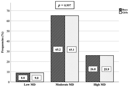 Frequencies and percentages of adherence to the MD are shown in Figure 1. No statistically significant differences were found by sex, showing a similar pattern between boys and girls. Overall, 8.9% of the schoolchildren had very low diet quality (n = 33), while 65.1% needed improvement to adjust intake to Mediterranean patterns (n = 241). Furthermore, only 25.9% of the schoolchildren had optimal adherence to the MD (n = 96).