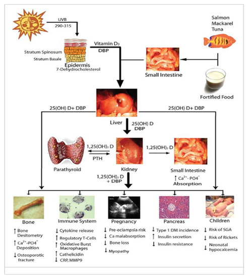 The metabolism of VITD and its functions in different systems of the human body are shown in Figure 1 [14].