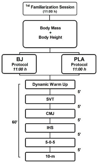 The study design was randomized cross-over, placebo-controlled, and double-blind. Participants arrived at the training facilities on two separate days under the same experimental conditions with 1 week between protocols to allow recovery and substance wash out. Participants were instructed to avoid any form of exercise leading up to each test and the ingestion of caffeine/alcohol in the 24 h prior to the testing. In session 1, participants were subjected to a preliminary assessment of body composition and underwent a familiarization session of the neuromuscular test battery. Then, on two separate occasions (sessions 2 and 3), when they arrived at the tennis training facilities, participants were provided with a supplement containing 70 mL of either BJ (Beet IT; James White Drinks Ltd., Ipswich, UK) or PLA (ECO Saludviva, Alicante, Spain). The trial was double-blinded such that one researcher (D.M.-L.) allocated all the participants’ drinks in a counter-balanced fashion (in each trial, 50% of participants ingested PLA and 50% ingested BJ beverages) with random assignment to each supplement (Research Randomizer, www.randomizer.org). Three hours after intake of BJ or PLA, subjects performed a standardized dynamic warm up protocol [33], and then a neuromuscular test battery was carried out, consisting of a tennis serve velocity test (SVT), countermovement jump (CMJ), isometric handgrip strength (IHS), 5-0-5 agility test (5-0-5), and 10 m sprint (10-m) (Figure 1). Furthermore, in both trials, the experimental procedures were performed at the same hour of the day to avoid the influence of circadian rhythms on performance [10].