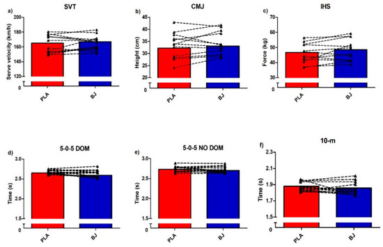 Effects of beetroot juice (BJ) or placebo (PLA) on (a) SVA: serve velocity test; (b) CMJ: countermovement vertical jump height; (c) IHS: isometric handgrip strength; (d) 5-0-5 DOM: agility test dominant side; (e) 5-0-5 NO-DOM: agility test nondominant side; (f) 10-m: 10 m sprint.