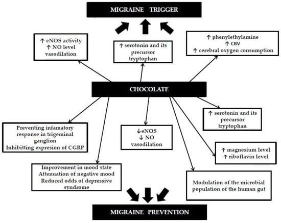 The question arises: Why does chocolate induce a migraine attack? One possible explanation is that flavanols stimulate eNOS activity, leading to increased NO generation, which may lead to vasodilatation [13]. However, the role of vasodilation in migraines is unclear, and recent findings challenge its necessity [41]. There are also some ambiguities regarding the influence of chocolate on NO production. On the one hand, a great number of studies indicate that cocoa flavanols increase NO levels, while other studies have surprisingly found that cocoa reduces NO production by inhibiting the expression of NO synthase [20,42,43,44]. Another possible link between chocolate and migraine attack is serotonin. The concentrations of this neurotransmitter increase during a migraine attack. Cocoa is also suggested to play a role in the release of serotonin, which is proposed to be involved in the pathogenesis of migraines. Serotonin and its precursor tryptophan were found in chocolate, with the highest serotonin level in chocolate found with a cocoa content of 85% [15]. Theoretically, it is possible that by increasing the serotonin level, chocolate consumption may induce a migraine attack. Nevertheless, existing studies have not confirmed this theory [45]. Phenylethylamine is also reported as a neurotransmitter that can initiate migraine-type headaches in susceptible individuals. In an animal study, PGA produced significant increases in CBF and cerebral oxygen consumption during the first 40 min of infusion. In contrast, a further increased phenylethylamine concentration constricted the cerebral bed (cerebral blood flow reduced by 28%), producing a pattern of vascular events similar to those seen in migraines [46].