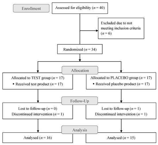 Subjects’ compliance with the inclusion and exclusion criteria was checked before their inclusion in the study. Forty subjects were assessed for eligibility and while 6 did not meet the inclusion criteria, 34 subjects were enrolled into the study. They were randomly assigned to either (a) a placebo group (mean age 55.0 ± 7.6 years) or (b) a test group (53.7 ± 6.2 years) receiving test syrup, with 17 subjects per group; there was no significant difference in age between groups (p = 0.59). Randomisation was performed using a simple randomisation procedure (computerized random numbers).