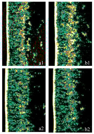 The influence of investigated products on the dermis density can be observed in Figure 3, showing an example of ultrasound images of the skin of two subjects—one from the test group and one from placebo group before the supplementation (Figure 3(a1,a2) respectively) and after 12 weeks of supplementation (Figure 3(b1,b2) respectively). After 12 weeks of supplementation with the test product, echogenicity is visibly increased.