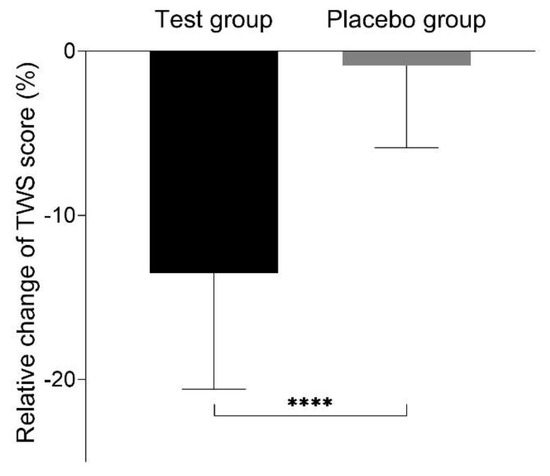 Relative change of total wrinkle score (TWS) from baseline after 12 weeks of supplementation for placebo and test group; **** p < 0.0001.