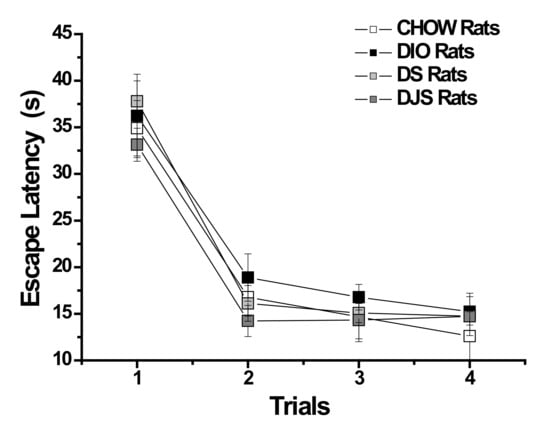 Figure 1 shows the learning progression during 4 days of training (four trials each day). Each trial represented the escape latency time taken to reach the platform in the same day trial. DIO rats took more time to reach the platform; however, this trend did not reach statistical significance (p > 0.05). In Table 3, we summarized the findings measured during the probe test. DIO rats significantly increased the time (s) taken to reach the platform quadrant (p < 0.05), while they decreased the time taken in the target quadrant (p < 0.05) and the swim speed (p < 0.05) tests. The supplementation in DIO rats did not affect the memory task (Table 3).