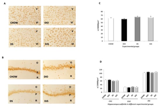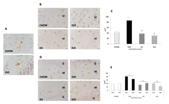 Sections processed for immunohistochemistry against ionized calcium-binding adapter molecule 1 (IBA-1), as markers of microglia cells, revealed an increase of activated microglia cells in DIO rats compared to the controls (Figure 5). Obesity induced a morphological change in microglia in brain areas. In CHOW rats, resting microglia was present at the level of different layers of the frontal cortex, in the stratum radiatum of the CA1 subfield, and in the hilum and stratum moleculare of the dentate gyrus (Figure 5B,D). In obese rats, typical elements of the reactive microglial cells were evident, with a clear increase in the area of soma without changes in the arborizations, as demonstrated in Figure 5A, obtained at 100x magnification. No phagocytic microglia were present in the frontal cortex or in the hippocampus of obese rats. Morphometric analysis highlighted a clear increase of the area of the soma in the DIO rats compared to the lean CHOW rats (p < 0.05) (Figure 5C,E). In the sections of DS and DJS groups, a decrease of the immunoreactive microglial cells was evident, with a significant decrease (p < 0.05) of the area of the soma (Figure 5B–E).