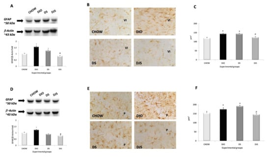 For GFAP immunoblots, a single band of approximately 50 kDa (Figure 4A,D) was revealed in the frontal cortex and hippocampus of the different groups. The intensity of the GFAP bands, normalized for the corresponding reference protein expression, was increased in both brain areas of DIO rats compared to CHOW rats (Figure 4A,D). Moreover, decreased expression of GFAP in DJS group compared to DIO was detected in both the frontal cortex and hippocampus (Figure 4A,D). The data from the immunohistochemistry analysis were consistent with Western blot results. In the frontal cortex and in the CA1 subfield, a marked increase in GFAP immunoreactive astrocytes was evident in the DIO group in comparison with the control, as well as a decrease in the DJS group (Figure 4 B,C,E,F), which seems to be the most effective treatment. In the sixth layer close to the corpus callosum, the size of astrocytes was larger in DIO rats than in the CHOW rats, whereas the tart cherries reduced the size (p < 0.05) (Figure 4B,C). In the hippocampus, in particular in the CA1 subfield, an increase of the mean immunoreactions area of GFAP hyper-reactive astrocytes was evident in rats fed with HFD (Figure 4E,F). Moreover, the groups of animal supplemented with tart cherry juice showed a significant decrease in the mean values of the immunoreaction area (p < 0.05) (Figure 4E,F).