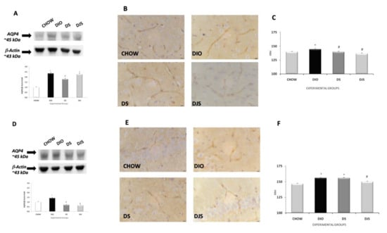 Exposure of membranes of the frontal cortex and hippocampus to anti-AQP4 antibody caused the development of a band at approximately 45 KDa (Figure 6 A,D) The results showed an increase of the AQP4 in the frontal cortex of the DIO compared to the CHOW rats (Figure 6A). In the frontal cortex, only in the DS group was there a decrease of AQP4 compared to the DIO rats. In the hippocampus of the DS and DJS groups, the AQP4 expression was reduced compared to the age-matched DIO rats (Figure 6A,D). Sections processed for AQP4 immunohistochemistry developed dark-brown staining around brain microvessels. The AQP4 expression was higher in DIO rats (Figure 6B,C) than CHOW rats and decreased in the DS and DJS groups (p < 0.05) (Figure 6B,C). At the level of the hippocampus, the densitometry analysis showed an increase of AQP4 immunoreactivity in DIO compare to CHOW rats (Figure 6E,F). On the contrary, a decrease of AQP4 was evident in the animals supplemented with tart cherry seeds and juice compared to the DIO rats (Figure 6F).