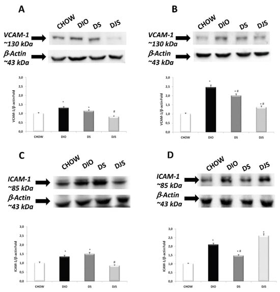 Western blot analysis (representative of three different experimental sessions) for VCAM-1 in the frontal cortex (A) and hippocampus (B), and for ICAM-1 in the frontal cortex (C) and hippocampus (D) in the CHOW, DIO, DIO after supplementation with tart cherry seeds (DS), and DIO after supplementation with seeds and tart cherry juice (DJS) groups. Graphs represent the intensity of bands normalized to the band intensity of the reference protein β-actin. The values are the mean ± S.E.M.; * p < 0.05 vs. CHOW rats; # p < 0.05 vs. DIO rats.