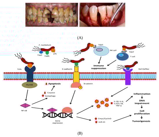 Periodontal disease patients clinically diagnosed (A) and schematic summary of the molecular pathways of F. nucleatum in CRC tumorigenesis (B). CRC: colorectal cancer; Gal-GalNAc: D-galactose-β (1–3)-N-acetyl-D-galactosamine; IL: interleukin, LPS: lipopolysaccharide; miR: microRNA: NF-κB: nuclear factor kappa-beta; NK: natural-killer; TIGIT: T-cell immunoglobulinand immunoreceptor tyrosine-based inhibitory motif domain; TLR: toll-like receptor; TNF-α: tumor necrosis factor-alpha. Upward red arrows: enhancement/stimulation; Downward red arrows: reduction (taken from Koliarakis et al., 2019 [37]).