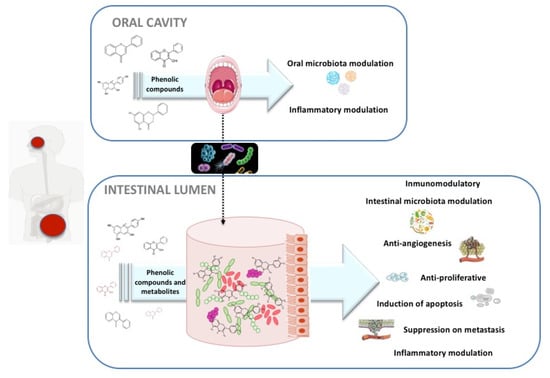 The current review reports the most relevant recent epidemiological and experimental studies about the role of oral and intestinal microbiota in the pathogenesis of CRC. In turn, the effect of dietary polyphenols as chemopreventive agents in CRC, both directly and through the modulation of the composition and activity of oral and intestinal microbiota, is also discussed. From the microbiota’s perspective, a higher abundance of oral periodontal Fusobacterium nucleatum, as well as an enrichment of intestinal Ruminococcus, Oscilobacter, Roseburia, Parviromonas micra, and Solobacterium moorei, has been suggested as biomarkers of CRC [48,49,50]. On the other hand, the higher plasma homovallinic acid concentrations [109] and the higher activity of β-glucuronidase [79], a microbial enzyme from intestinal bacteria related with the polyphenols metabolism, have been recently associated with greater risk of CRC. These findings highlight that, in the future, the oral and intestinal microbiota could be used as novel markers of clinical significance to differentiate healthy and tumor patients, while natural compounds, such as polyphenols, can be used for preventive care.