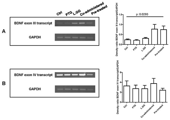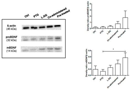 This study revealed that the experimental treatments (administration of PTG and L.GG, alone or in combination) significantly altered the levels of mBDNF, as evaluated by Western blotting.