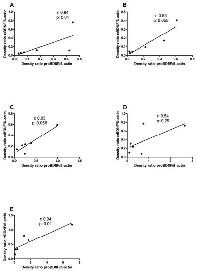 The levels of precursor and mature BDNF positively correlated, reaching statistical significance in the Ctrl and pre-treated groups (r: 0.94, p: 0.01, Spearman test) (Figure 2A,E, respectively) and approached significance in PTG and L.GG rats (r: 0.83, p: 0.058, Spearman test) (Figure 2B,C, respectively).