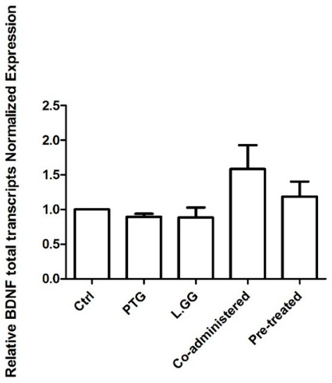 The results of the present study show that the administration of L.GG was able to increase mBDNF compared to Ctrl rats slightly. When L.GG was co-administered with PTG, the increase in mBDNF was higher than that observed in rats treated with L.GG alone. This increase was even higher in PTG-pretreated rats, leading to significantly different neurotrophin levels from those in PTG rats. Therefore, L.GG showed only a slight positive effect on BDNF levels under normal conditions, while it was able to rescue the reduced expression of BDNF, thus repairing the adverse impact induced by a ten-day PTG administration.