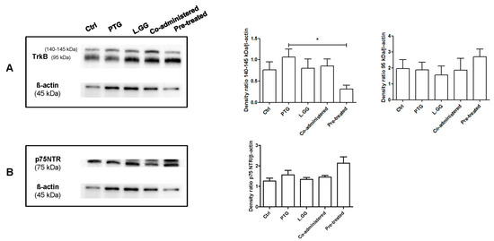 The effect of PTG and L.GG administration on the levels of TrkB was evaluated. In brain samples, a 140–145 kDa and a 95 kDa TrkB isoforms were detected. The experimental treatments affected the levels of the 140–145 isoform (p: 0.0433, Kruskal–Wallis test). The administration of PTG induced a 39% increase in protein levels in comparison with Ctrl; an increase was also observed when L.GG was administered, both alone and in combination with PTG (5% and 12% increase, respectively). In contrast, the administration of L.GG after the PTG treatment induced a significant 59% reduction in protein levels compared to PTG (p < 0.05, Dunn’s multiple comparison post-test). Changes in the levels of the non-glycosylated form were not statistically significant (Figure 5A).
