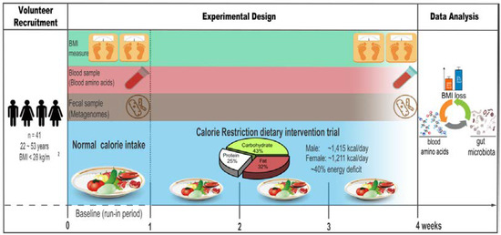 Overview of the experimental design. Illustration of our experimental design, including a 1-week run-in period (baseline) and a 3-week calorie restriction (CR) dietary intervention trial with approximately 40% energy deficit of the recommended daily calorie intake (men, ~1414.9 Kcal/day; women, ~1210.6 Kcal/day). Body Mass Index (BMI), fasting blood samples, and fecal samples of 41 enrolled healthy and non-obese subjects were collected before and after the intervention to assess the effects of CR on BMI, blood amino acids, and the gut microbiome.