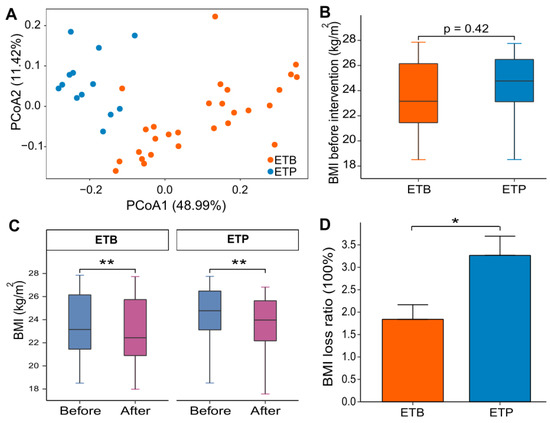 A short-term CR intervention altered BMI. (A) Principal coordinates analysis (PCoA) based on genera-level Bray–Curtis distance between all baseline fecal samples. Orange, subjects of enterotype Bacteroides (ETB) and blue, subjects of enterotype Prevotella (ETP). (B) Baseline BMI between ETB and ETP subjects. (C) Changes in BMI before and after intervention in individuals of each enterotype. (D) Boxplot showing BMI loss ratio between ETB subjects and ETP subjects. *, P < 0.05; **, P < 0.01.