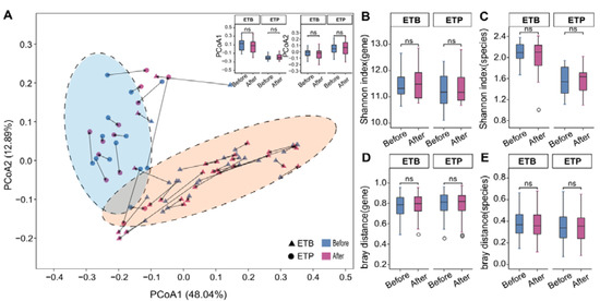 Overall gut microbial composition of two enterotypes before and after the CR. (A) Species-based principal coordinates analysis (PCoA) of subjects before and after the CR trial. Triangle, samples of ETB; circles, samples of ETP. Arrows indicate paired samples from the same individual. Boxplot showing the projected coordinate 1 (PCo1) and PCo2 of samples before and after the intervention. (B,C) α-diversity (Shannon index) at the gene and species levels before (blue) and after (red) intervention in each enterotype group. (D,E) β-diversity (Bray–Curtis distance) at the gene and species levels, before (blue) and after (red) the intervention in each enterotype group. ns—no significance, P > 0.05, Wilcoxon signed-rank test.