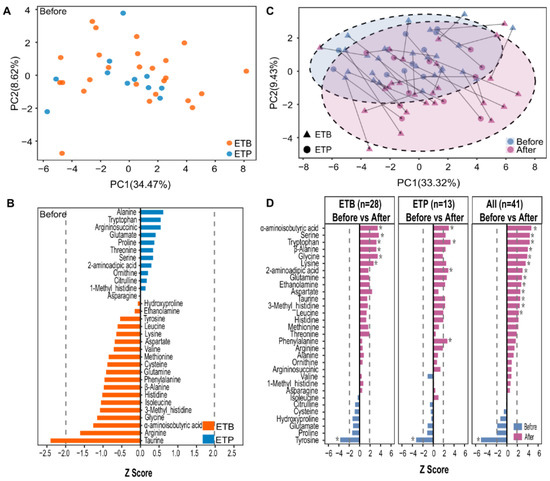 A short-term CR intervention altered the blood amino acids. (A) Principal component analysis (PCA) of 41 subjects using baseline blood amino acid profiles. Orange, ETB; blue, ETP. (B) Comparison of baseline blood amino acid levels between ETB and ETP subjects; dashed lines indicate the absolute Z score of 1.96 (P = 0.05); orange and blue bars indicate that the Z-score of blood amino acid was overrepresented in ETB and ETP subjects, respectively; Wilcoxon rank-sum test, P values are transformed to Z-scores to represent enrichment directions. (C) Amino acid-based PCA of samples before and after the intervention. Triangle—samples of ETB subjects; Circles—samples of ETP subjects. Arrows indicate paired samples from the same individual. (D) Changes in blood amino acid concentrations of ETB subjects, ETP subjects, and all subjects before and after the intervention. Wilcoxon signed-rank test, P values are transformed to Z-scores to represent enrichment directions. Dashed lines indicate the absolute Z score of 1.96 (P = 0.05). Asterisk (*) indicates the statistical significance at Benjamini–Hochberg (BH) adjusted P < 0.05.