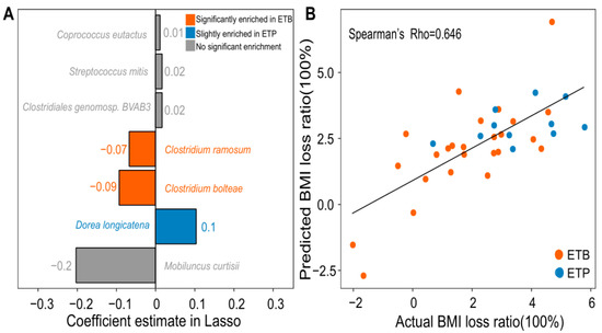 Prediction of BMI loss ratio using baseline abundances of gut microbial species. (A) Bar plot showing the 7 gut microbial species selected by least absolute shrinkage and selection operator (Lasso). Bar length indicates a regression coefficient of each species estimated by Lasso. Orange, species significantly enriched in ETB subjects (BH-adjusted P < 0.05); blue, species slightly enriched in ETP subjects (P < 0.05 and BH-adjusted P = 0.06); grey, species with no significant enrichment between two enterotypes (P > 0.05). (B) Scatter plot showing prediction performance of BMI loss ratio based on the 7 selected species. Leave-one-out cross-validation (LOOCV) was applied to evaluate the performance of the generalized linear model (GLM), showing a strong Spearman’s rho between actual BMI loss ratios and predicted BMI loss ratios of 0.646. Red circles—ETB individuals; blue circles—ETP individuals.