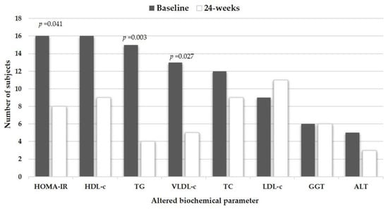 Regarding the biochemical parameters, the initial elevated mean values of HOMA-IR, TG, and VLDL-c significantly normalized at 14-weeks and were maintained until the end of the dietary intervention. Likewise, when comparing baseline vs. post-intervention state of the parameters, a significant final decrease in mean glucose and insulin values was observed, but LDL-c increased (Table 3). Figure 1 displays the frequency of individuals with metabolic risk factors at baseline and after nutritional treatment. The regionalized GENOMEX diet significantly reduced the frequency of subjects with IR (48.5% vs. 24.2%, p = 0.041), hypertriglyceridemia (45.5% vs. 12.1%, p = 0.003) and elevated VLDL-c (39.4% vs. 15.2%, p = 0.027) as well as an important proportion of participants normalized hypoalphalipoproteinemia (48.5% vs. 27.3%, p = 0.076).