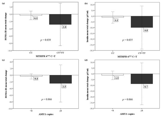 The mean total changes achieved in the anthropometric and biochemical parameters after the dietary intervention were compared between carriers and non-carriers of each adaptive genetic variant. The mean decrease in HOMA-IR and insulin was significantly higher in subjects with the MTHFR 677 CT or TT genotypes than those with the CC genotype (Figure 2a,b). The same metabolic improvement was observed in subjects with ≥ 6 copies of AMY1 compared with those with < 6 copies, although this change did not reach statistical significance (Figure 2c,d). No other adaptive allele was associated with the anthropometric or biochemical response to the GENOMEX diet.